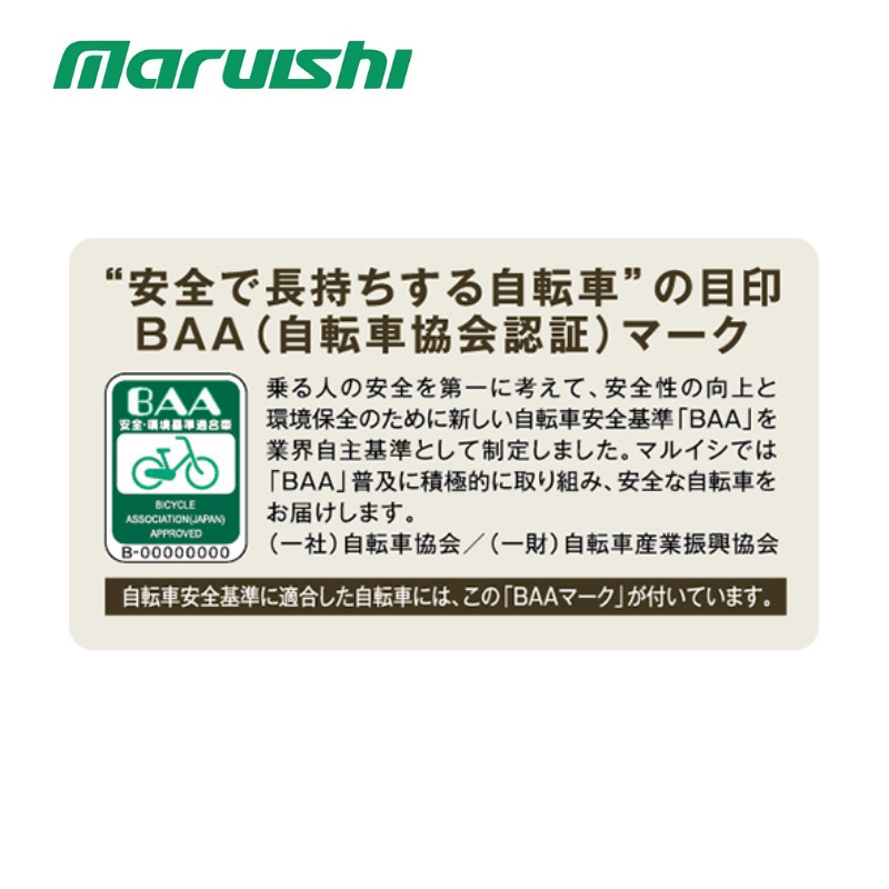 Mỗi chiếc xe đạp cào cào FRESH TOWN trước khi xuất xưởng đều phải đạt chuẩn BAA (Bicycle Association (Japan) Approved). Đây là chứng chỉ uy tín nhất tại Nhật Bản về độ an toàn, độ bền của khung sườn, hệ thống phanh và các vật liệu không gây độc hại cho người dùng. Khi mua xe tại nghiahai.com, bạn sẽ thấy tem BAA được dán rõ ràng trên khung xe.